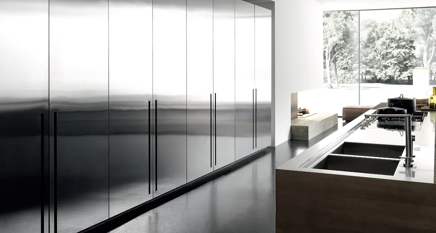 Enfin, le modèle Fly exprime son caractère dans les détails : un insert en inox intégrant évier et plaques de cuisson, installé à fleur dans un plan en noyer oxydé. Les chants biseautés à 45° assurent à la fois élégance et ergonomie, unifiant les volumes et servant de système d’ouverture intégré.