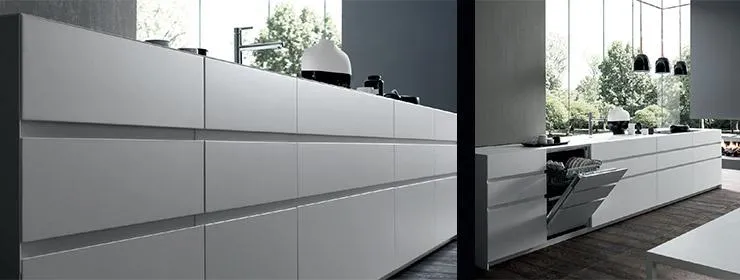 Autre innovation : l’élément Blade over worktop, un module mural à porte saillante de 15 cm finition calce, qui remplace le meuble haut traditionnel et offre un espace de rangement modulable (45, 60 ou 75 cm).