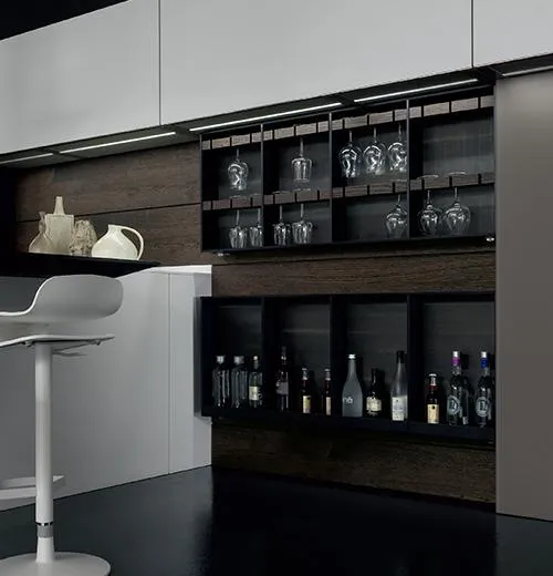 Le système Wall, véritable innovation, structure l’espace situé entre meubles bas et meubles hauts. Il permet de multiplier les accessoires fonctionnels sans jamais sacrifier l’élégance. Ainsi, Light allie parfaitement design épuré et praticité au quotidien.