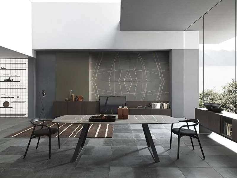 Le séjour gagne en élégance avec les panneaux en pierre ou stratifié imitation pierre pour moduler le budget, caractéristique de la transversalité des finitions du modèle MH6.
