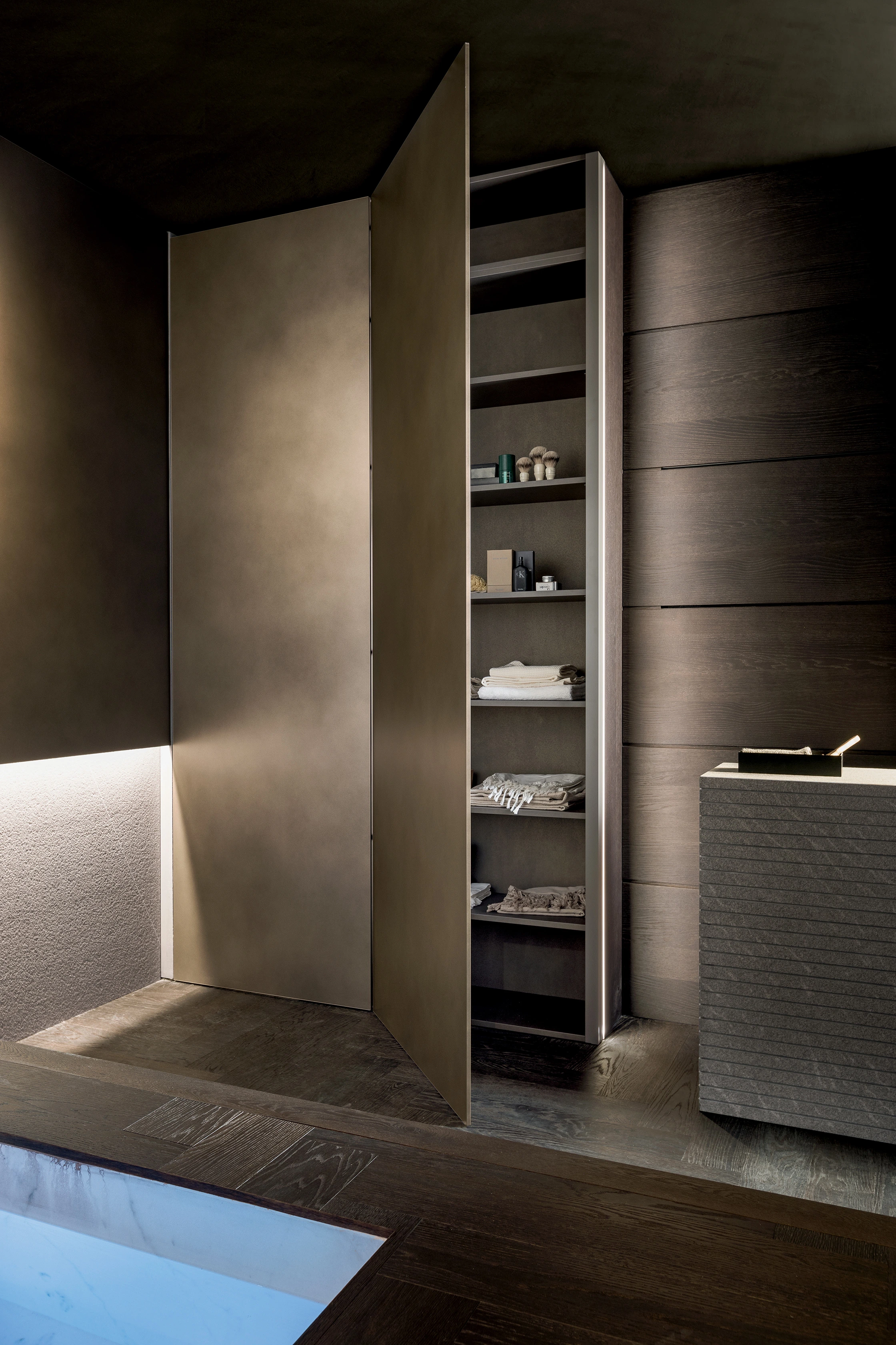 Les rangements sont pensés avec la même ingéniosité : un grand miroir dissimule une colonne de rangement personnalisable en finitions Milltech grigio, lava, riace ou eucalyptus.