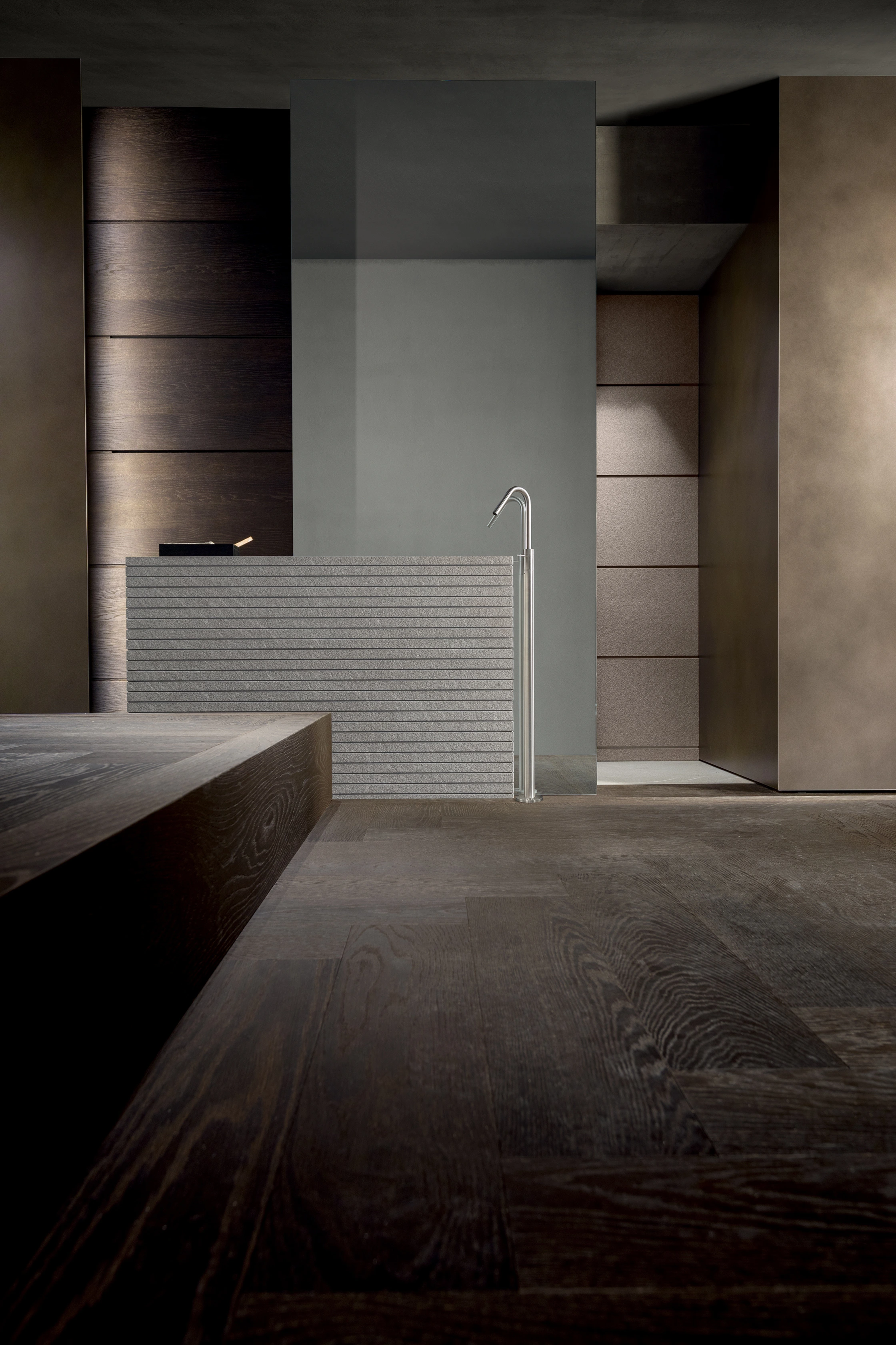 La salle de bains Blade Modulnova se distingue par l’élégante utilisation de la Pietra Piasentina, travaillée avec un fini rainuré sophistiqué. Cette pierre noble habille un bloc au sol intégrant une vasque, dont l’aspect sculptural confère à l’ensemble une allure architecturale et raffinée.