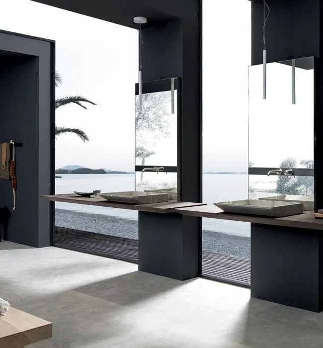 La salle de bains Surf Modulnova se distingue par son plan plié de 52 mm en chêne oxydé, suspendu sur un cadre en métal noir et associé à une vasque en Pietra Piasentina. Cet équilibre entre bois, métal et pierre crée un style affirmé et minimaliste.